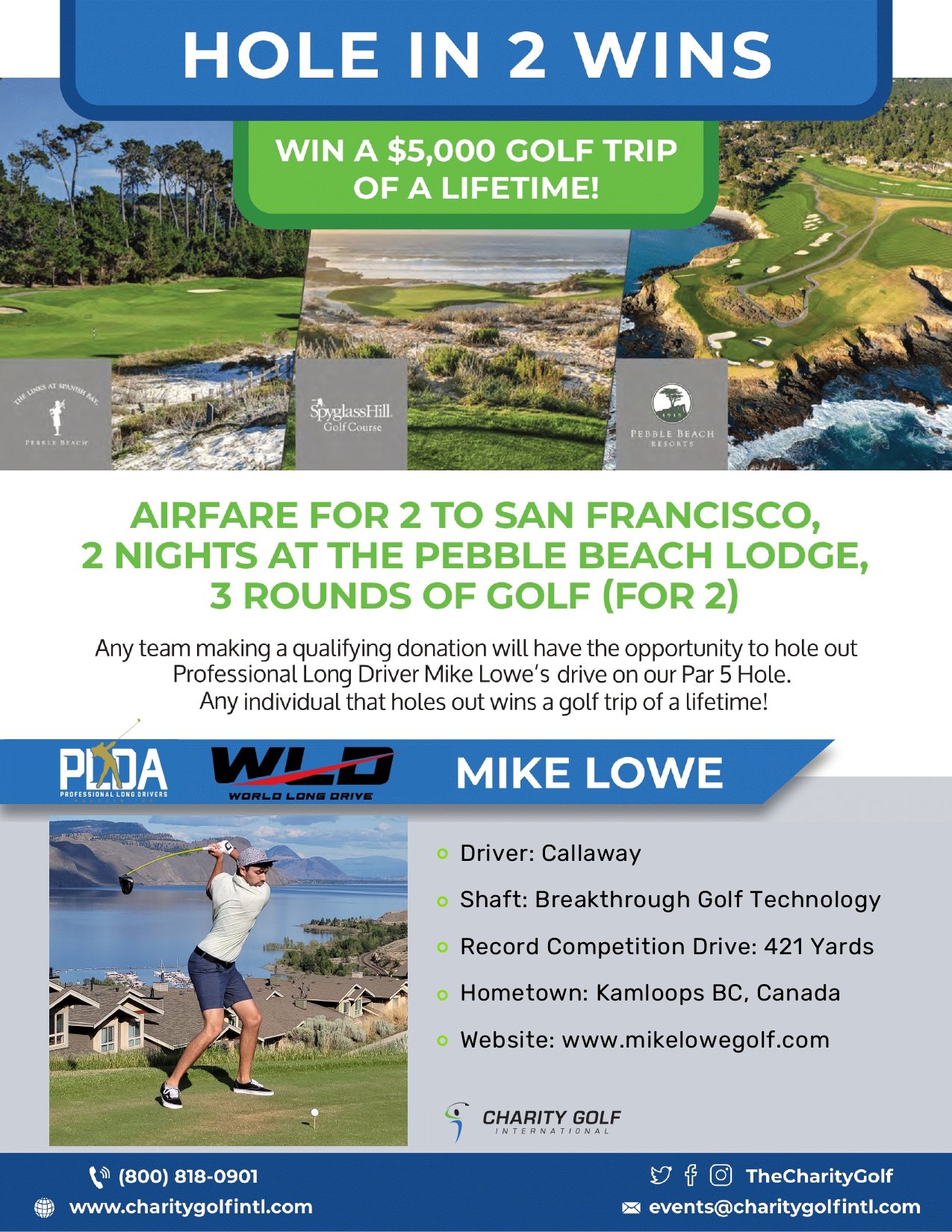 Each team can have the opportunity to participate in the hole-in-2 contest to win a trip for two to Pebble Beach including airfare, a 2 night stay and 3 rounds of golf!